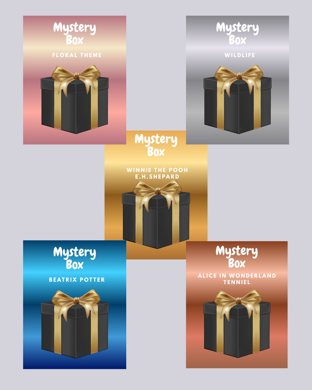 Mystery boxes full of exciting one of a kind creations. Each mystery box is carefully curated with one of a kind creations that align with one of the enchanting 5 themes: Florals, Wildlife, Winnie the Pooh, Beatrix Potter, or Alice in Wonderland. The themed mystery boxes offer a diverse range of creations, ensuring there is something for everyone to enjoy.