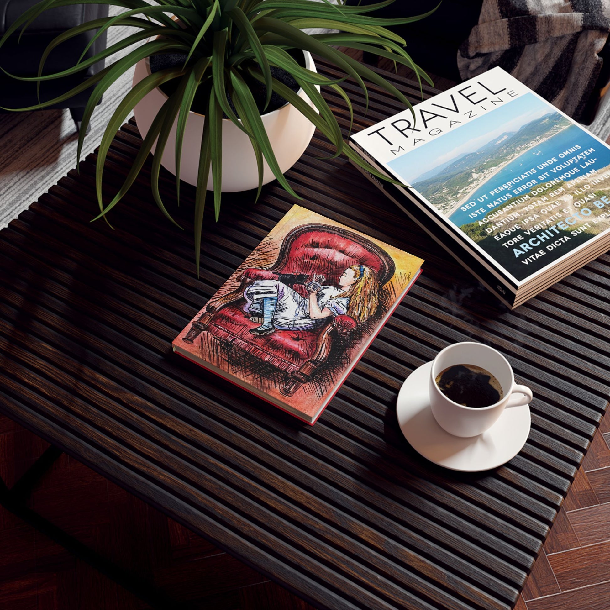 This hard-backed journal opens like a secret door. The cover shows a dreamy, vintage illustration of a Alice, from Alice in Wonderland, reclining in a worn red armchair — a quiet moment between adventures. The matte laminated full-wrap print keeps colours vivid while feeling soft under the hand. Inside, a flexible case wrap binding lets the book lie flat so thoughts, sketches, and plans flow without resistance. With 128 pages of 90 gsm paper and options for ruled, graph, or blank layouts, it’s set up for stories, maps, lists, or experiments. Compact at 5.2" x 7.4", it slips into a bag and waits for the next pause in a busy day or a long, cozy evening of reflection.
