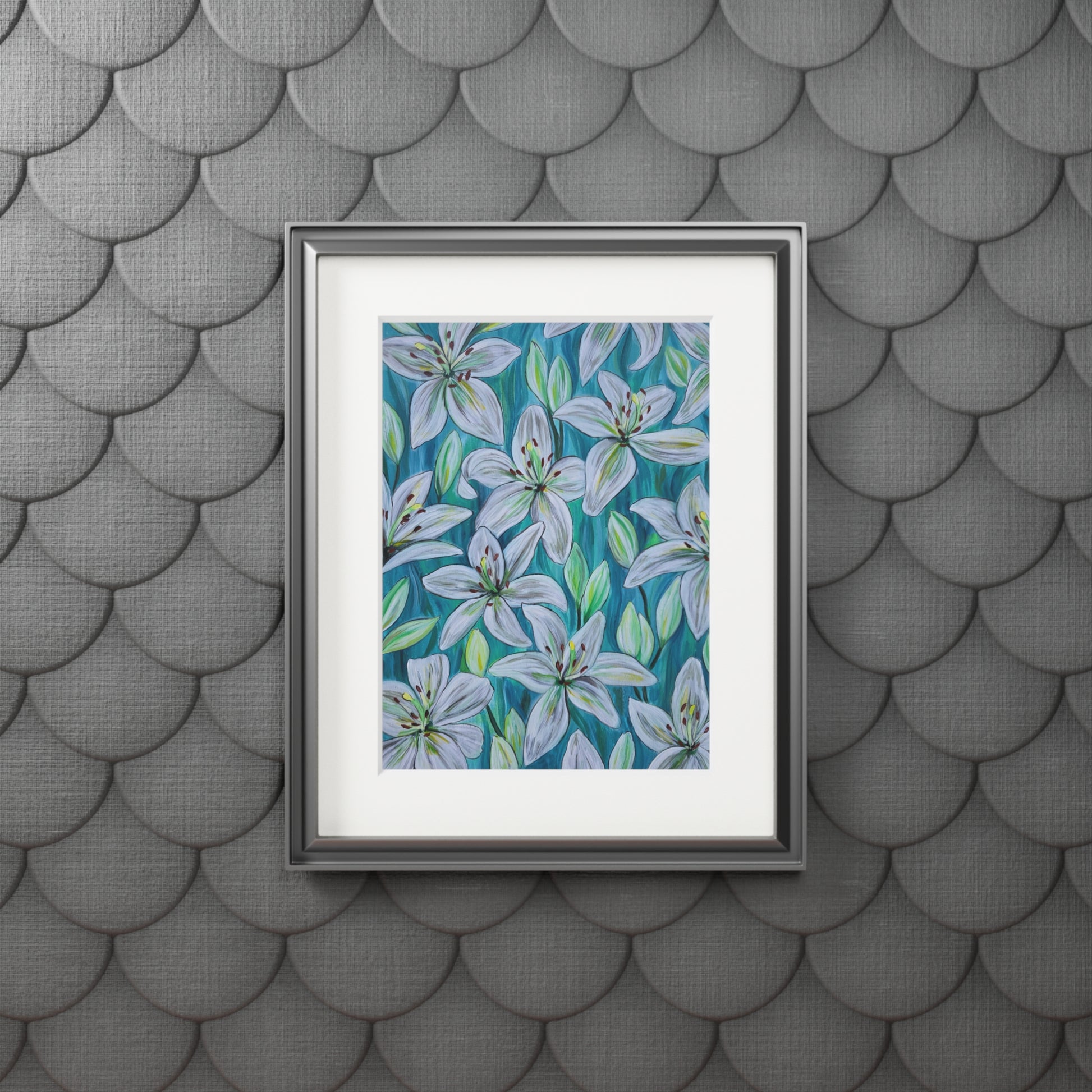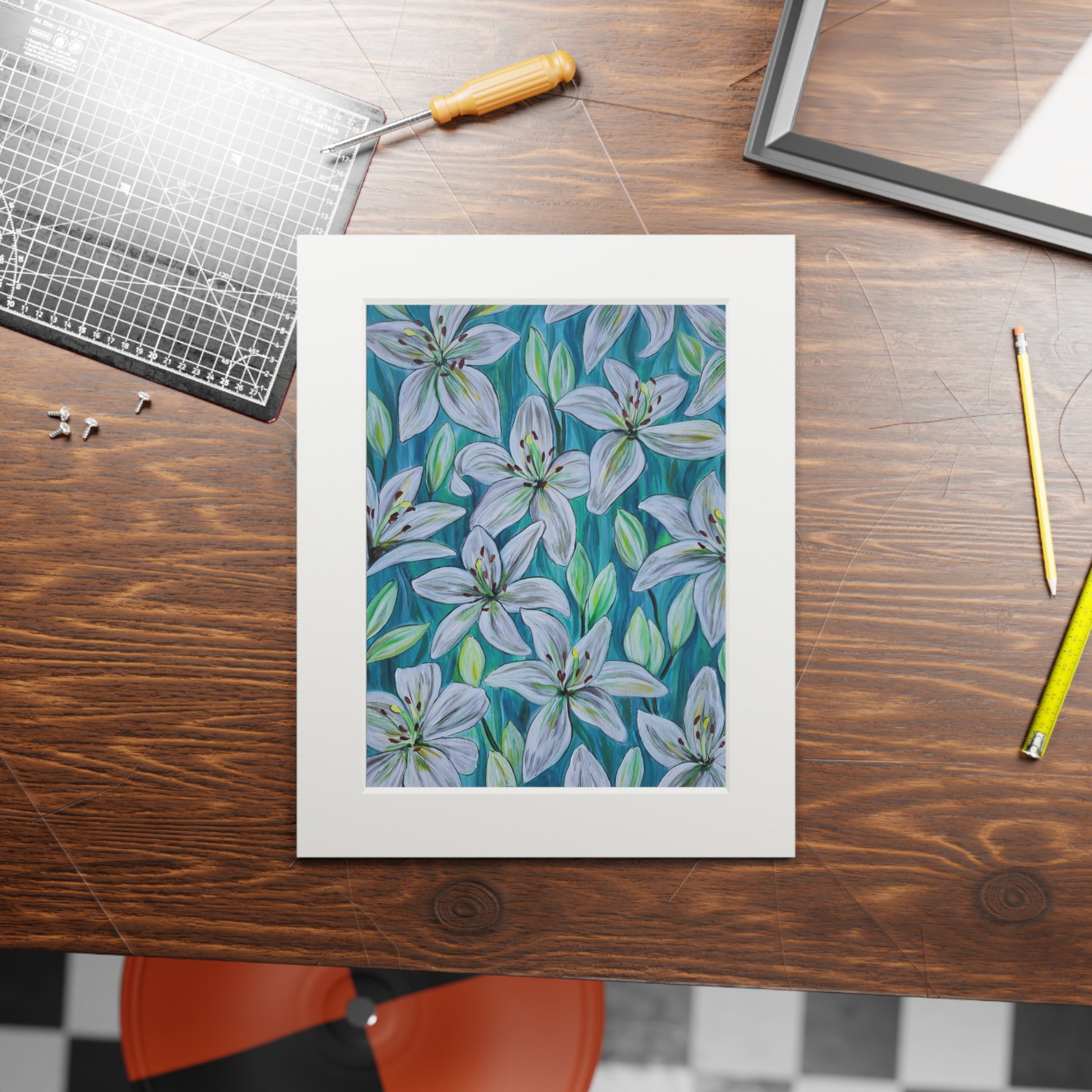 Soft, painterly lilies bloom against a turquoise wash — this fine art print arrives mounted behind a natural white passepartout that gives the artwork room to breathe. Printed with archival giclée inks on 175gsm fine art paper, the colors stay rich and luminous even with regular sunlight. The thick 2mm textured window mount frames the image with a subtle, museum-like border so the piece reads as a finished, gallery-style presentation the moment you slide it into a protective frame or hang it on the wall. Small assembly is required on arrival: the mount and print are delivered separately so you can choose your preferred protective frame and glass.