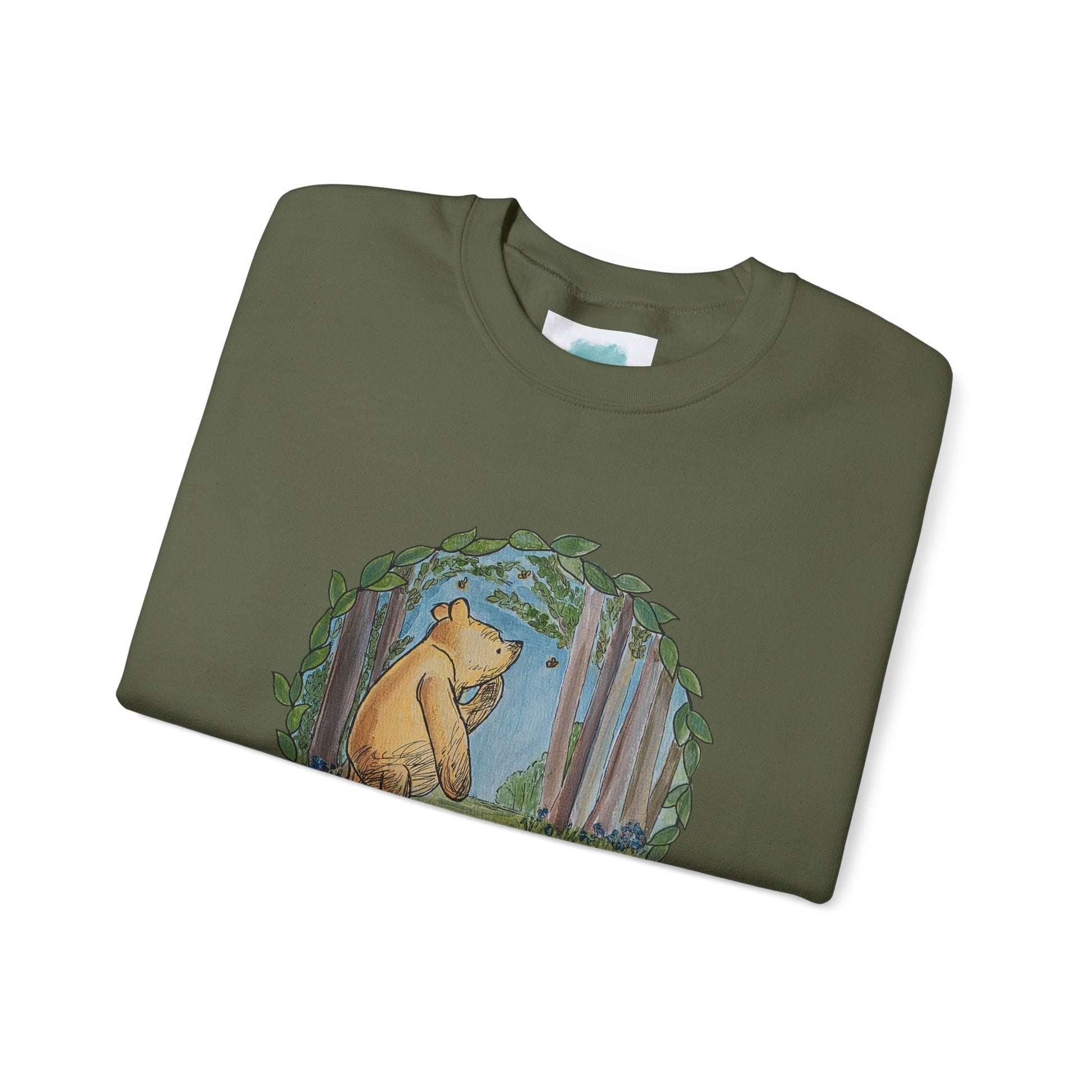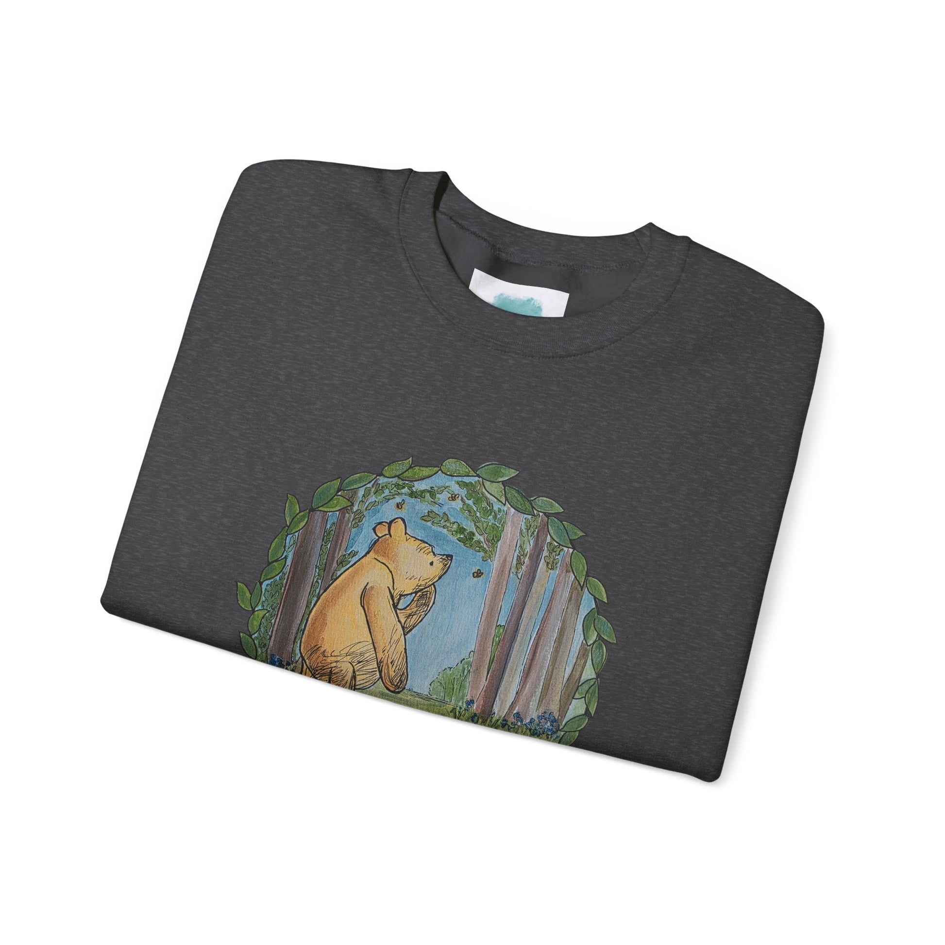 A soft, lived-in crewneck that feels like a quiet walk through the woods. This sweatshirt pairs a classic silhouette with a gentle woodland illustration—Winnie-the-Pooh pausing among ferns and trees—printed on the chest and a subtle vertical text along the sleeve. It’s warm without being bulky, with medium-heavy fabric and reinforced seams that hold up to repeated wear. Wear it for slow mornings, bookstore afternoons, or evenings around a low-lit fire; the muted cream base and nature-focused artwork settle into your everyday rotation and age gracefully with you.