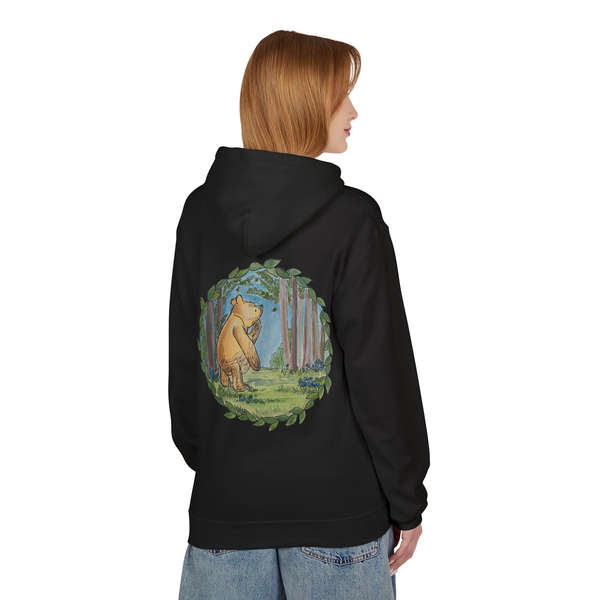 A cozy midweight hoodie that feels like a soft exhale on slow mornings. The front whispers with a delicate, vintage-style title while the back opens into a gentle woodland scene: a warm, watercolour Winnie the Pooh pausing amid trees and bluebells, framed by a ring of leaves. It drapes with a relaxed, dropped-shoulder silhouette and a roomy pouch pocket for hands or small finds. Thoughtfully made — OEKO-TEX certified fibers and production in socially responsible, FLA/WRAP-partnered facilities — it’s the quiet companion for reading nooks, park strolls, or slow weekends spent in nature’s company.