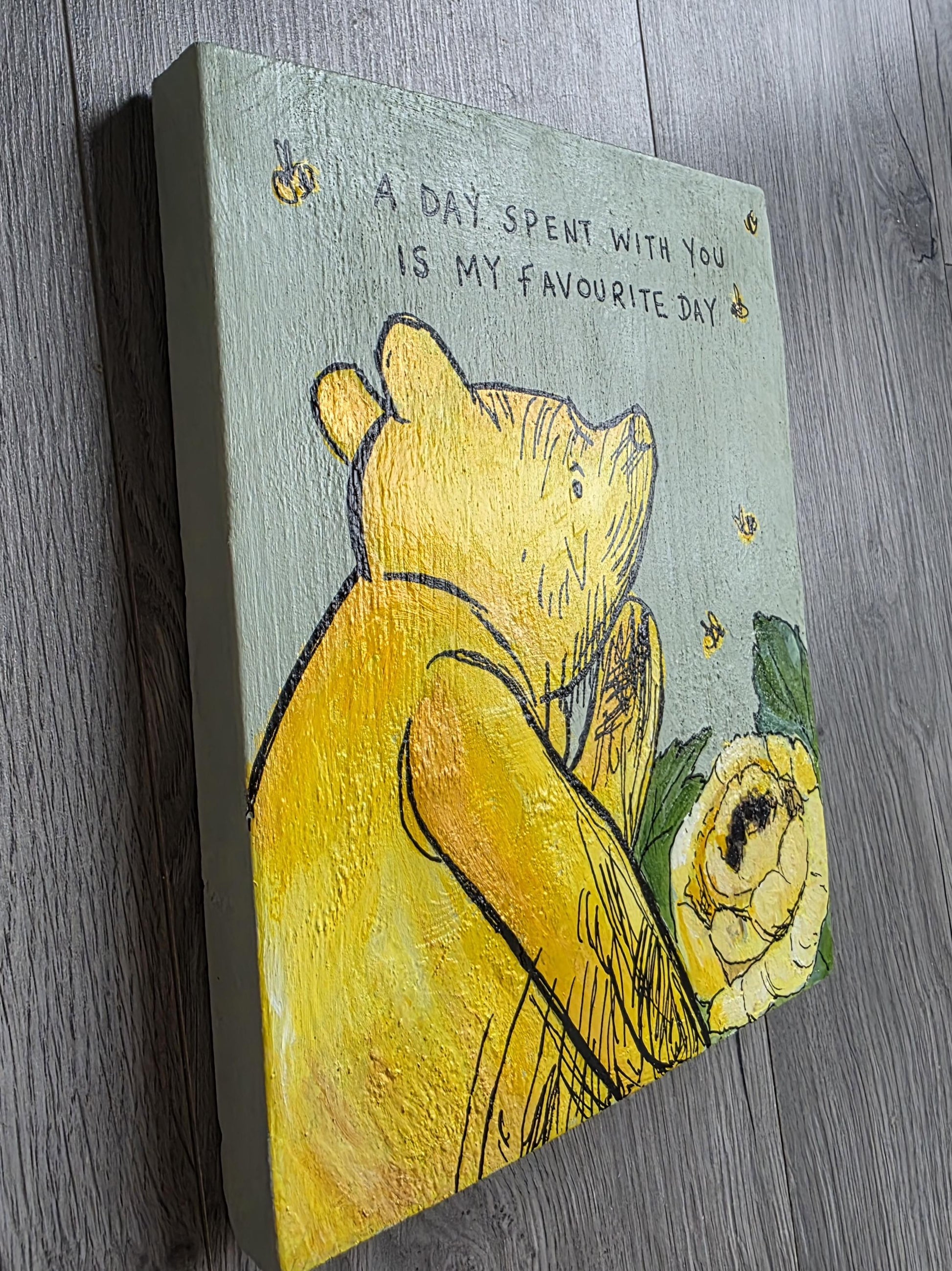 Handpainted by Jessica, E H Shepards original illustration of Winnie, looking up at a quote that reads 'A day spent with you is my favourite day'' surrounded by florals and bees.