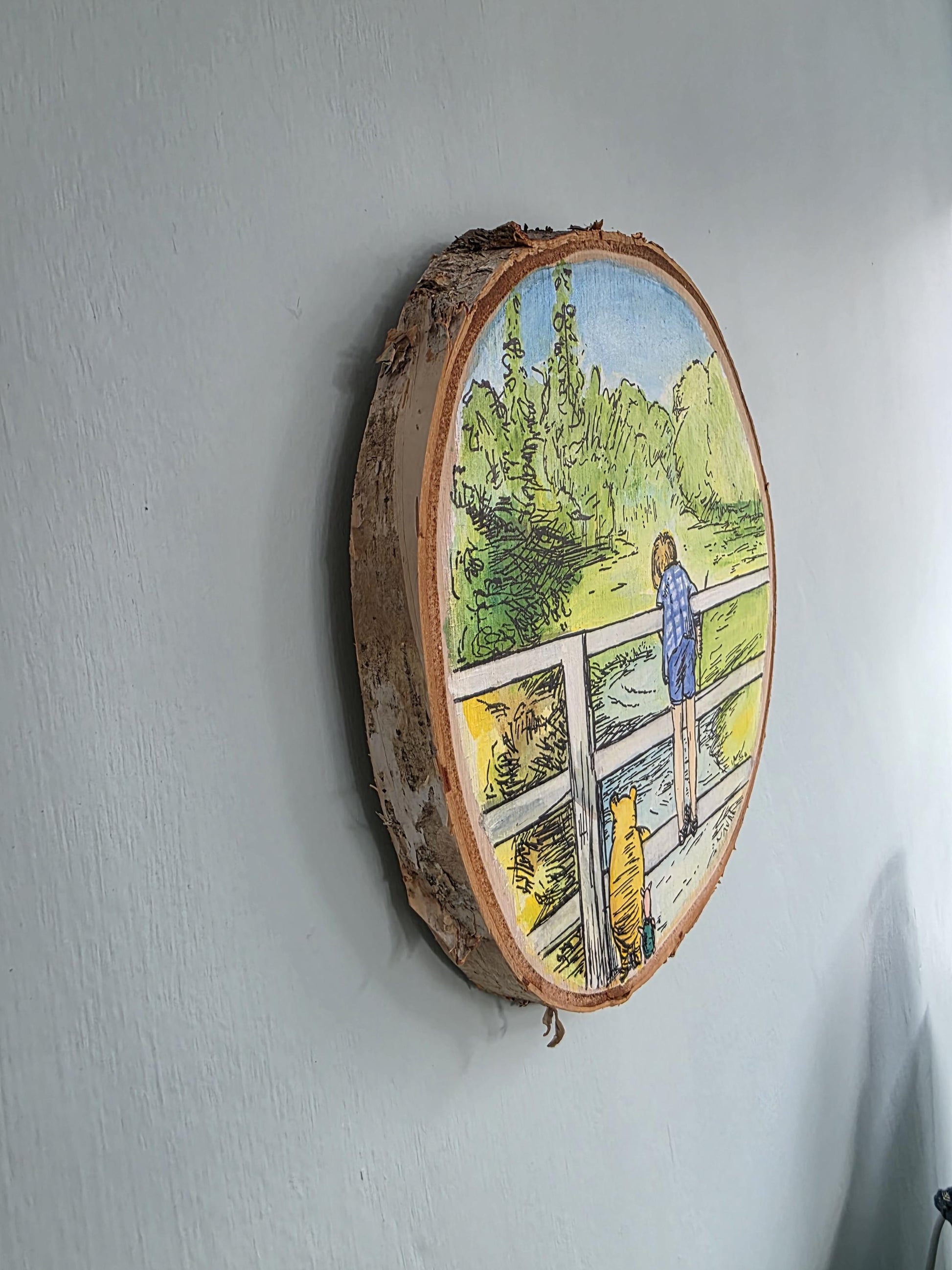 A hand painted piece of art of Winnie the Pooh playing Pooh sticks with Christopher Robin, a popular scene from the classic children's story book Winnie the Pooh by EH Shepard.